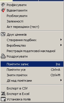Для того щоб виконати однотипні операції над записами, їх потрібно виділити. Виділення одного запису здійснюється за допомогою клавіши «Ins» або з допомогою контекстного меню пункт «Помітити запис».