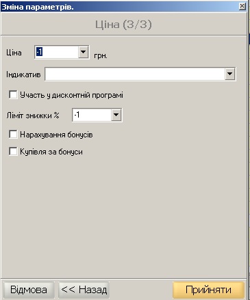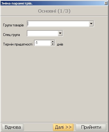 Основне вікно «Зміни параметрів» дає можливість користувачу вибрати групу товарів, спеціальну групу та термін придатності