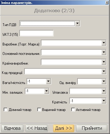 такі як: Тип ПДВ, Торгова марка, Основний постачальник, країна виробник, вага, міннімальний залишок, одиниці виміру, ділимість, видимість, активність та участь у дисконтній програмі