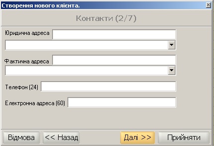 Після заповнення основної інформації про клієнта потрібно натиснути кнопку «Далі», що призведе до відкриття закладки по заповненню контактної інформації по клієнту:
