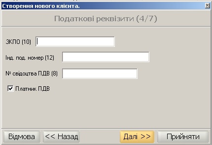 Закладка «Податкові реквізити» вікна «Створення нового клієнта» включає в себе інформацію про: