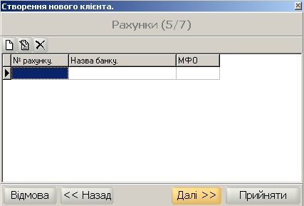 Закладка «Рахунки» вікна «Створення нового клієнта» необхідно вказати банківські реквізити клієнта (можливо зазначати декілька банківських реквізитів).