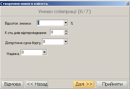 Закладка «Умови співпраці» вікна «Створення нового клієнта» необхідно вказати кількість днів відтермінування по даному клієнту, та допустиму сумму боргу