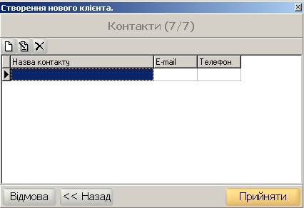 Закладка "Контакти" вікна «Створення нового клієнта» необхідно вказати назву контакту, е-мейл та телефон