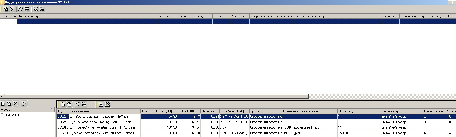 в нижній половині робочої області знаходится інформація про записи по яким проводилось Автозамовлення (дана інформація взята з довідника «Товари»), зокрема: