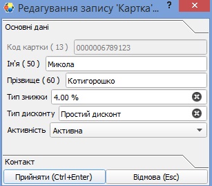 - "Код картки" - унікальний код картки, що являє собою штрихкод для пошуку на касі;