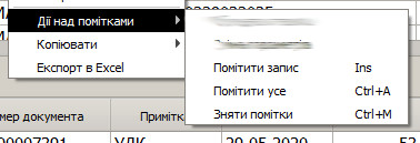 Для зняття виділення запису потрібно перейти на виділений запис і нажати клавішу «Ins». Щоб виділити усі записи в даному довіднику використовується комбінація гарячих клавіш Ctrl+A (виділення усіх записів з допомогою контекстного меню пункт «Помітити усе»). Для відміни виділення всіх записів використовується комбінація гарячих клавіш Ctrl+M (зняття виділення усіх записів з допомогою контекстного меню пункт «Зняти помітки»).